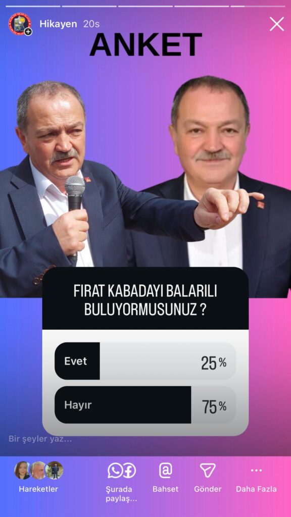 Muslu Belediye Başkanı Fırat Kabadayı hakkında sosyal medyada düzenlenen ankette çarpıcı sonuçlar ortaya çıktı. Ankete katılanların yüzde 75’i Kabadayı’yı başarılı bulmadığını ifade etti.